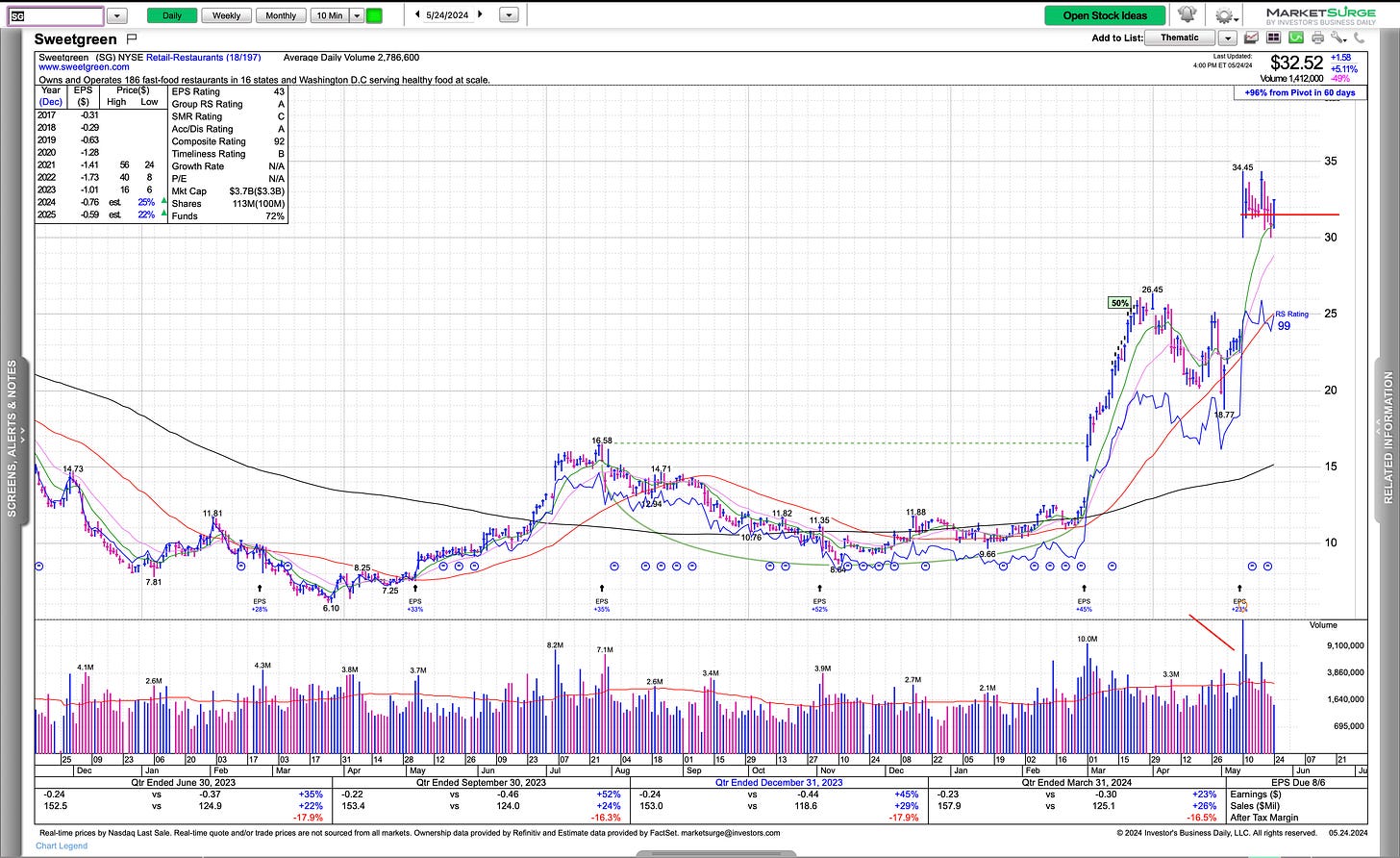 SG is a new IPO that had massive volume and consolidating, this one can go and is a low risk entry here.