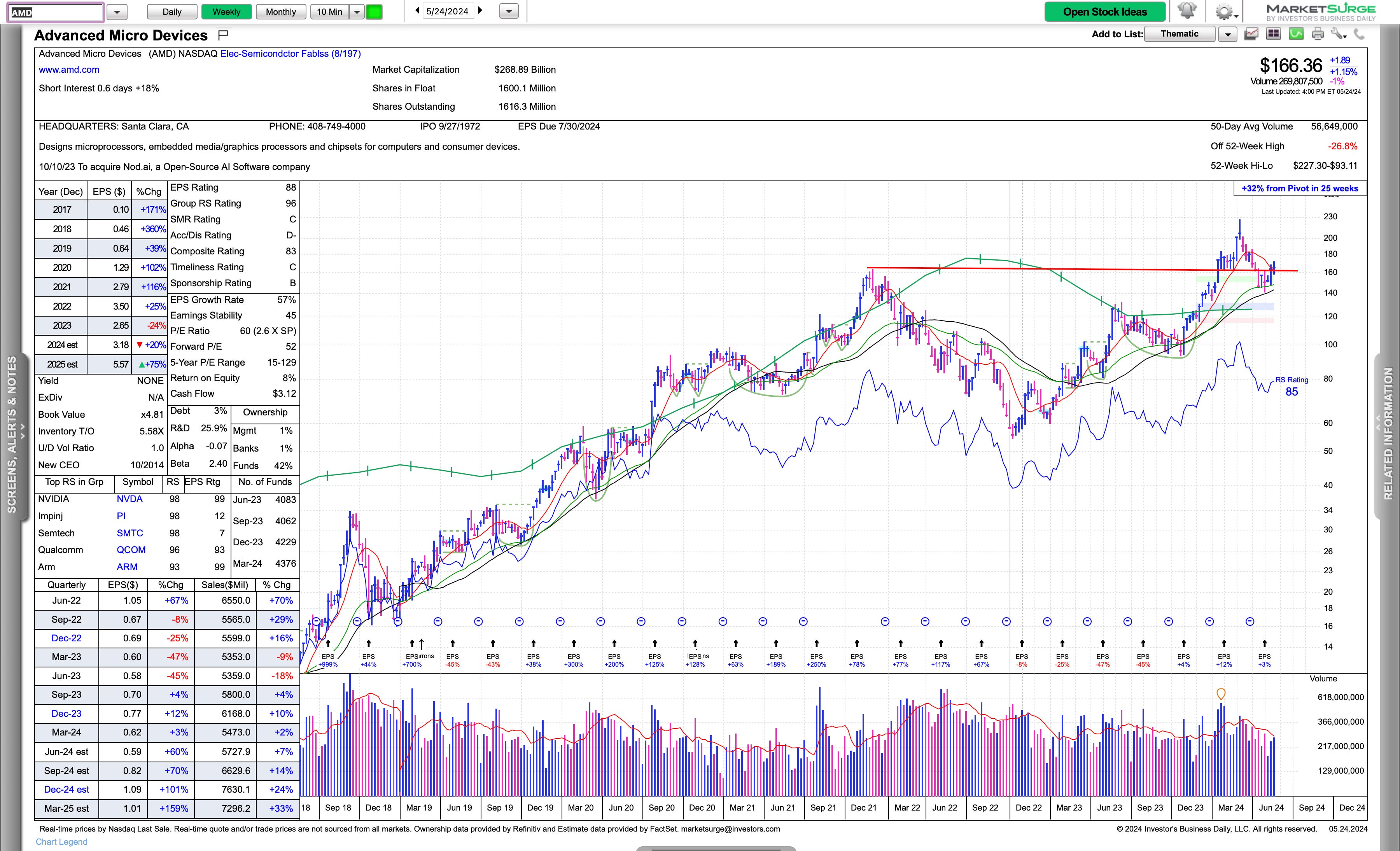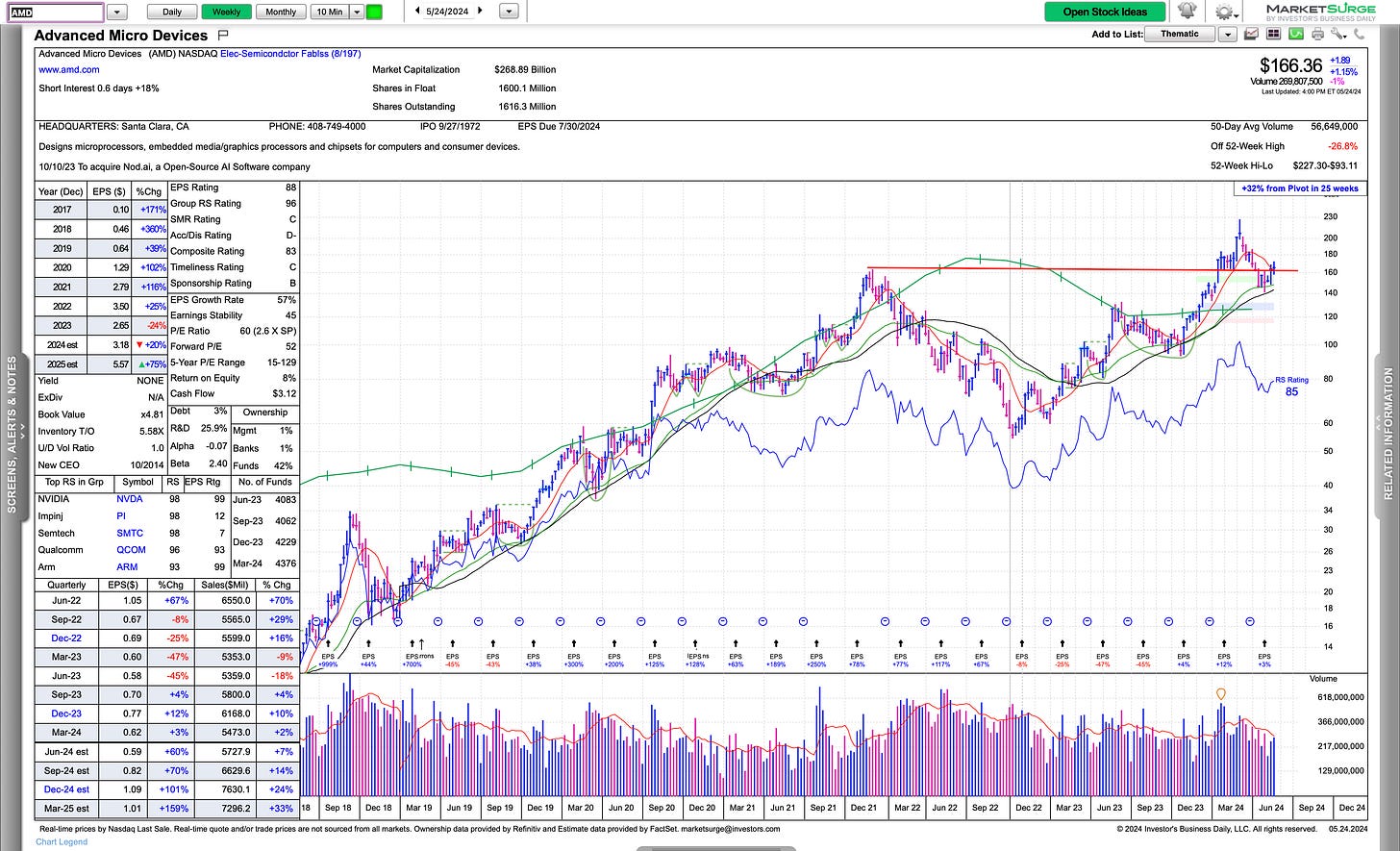 AMD is a top setup here with a revisit of the previous breakout level and holding, may need to consolidate here, however, it looks like it’s going to form the right side of a base, and if that occurs, you have a base on another base, which is quite bullish in the top sector.