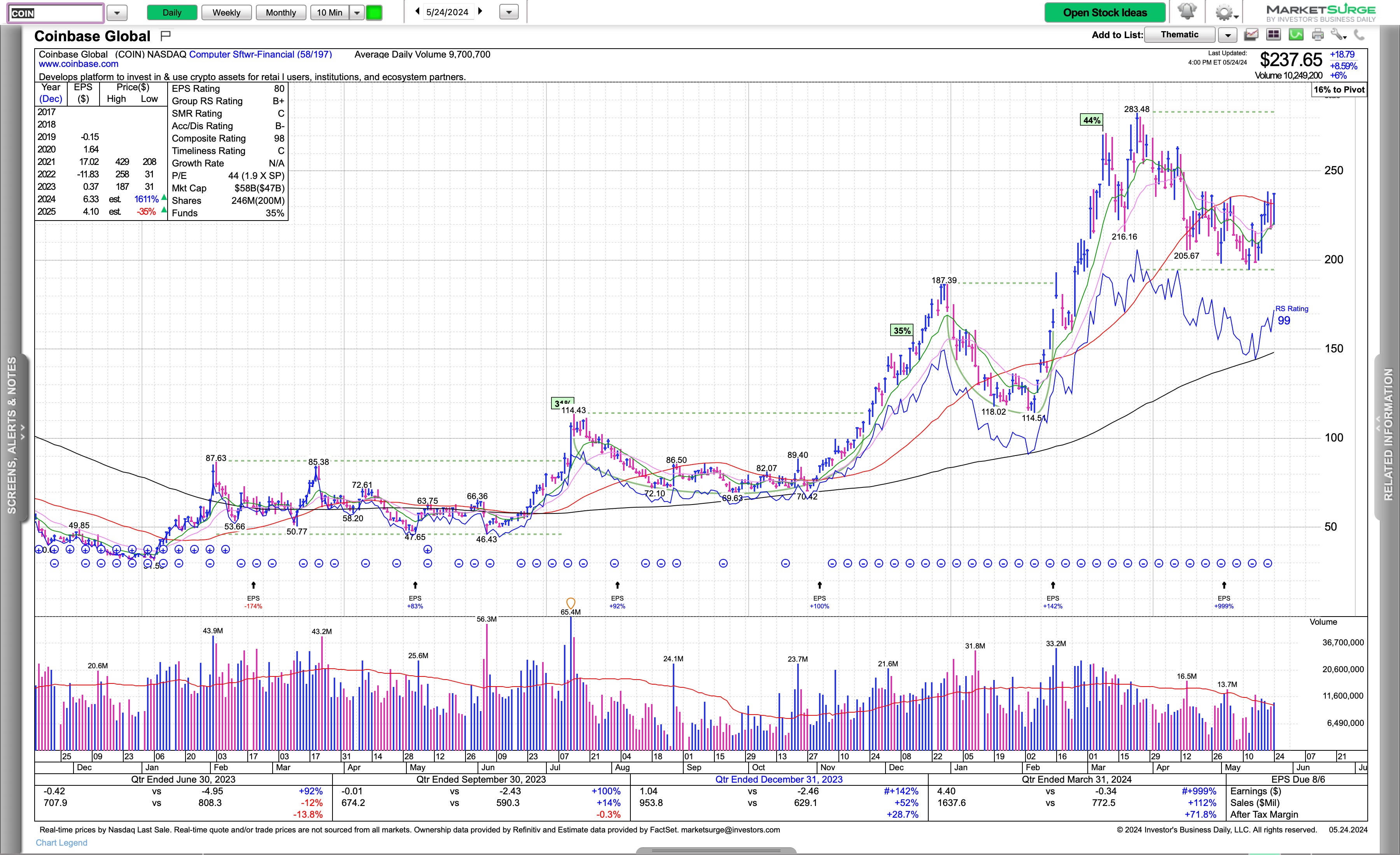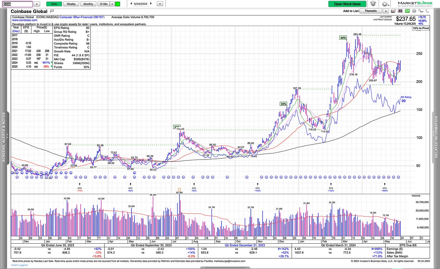 COIN which has been interesting as it consolidated at the 50 billion market cap was getting interesting and starting to get frustrating as there was wide price action and little traction on a week to week basis however it’s firmed up and back above the 50 day.