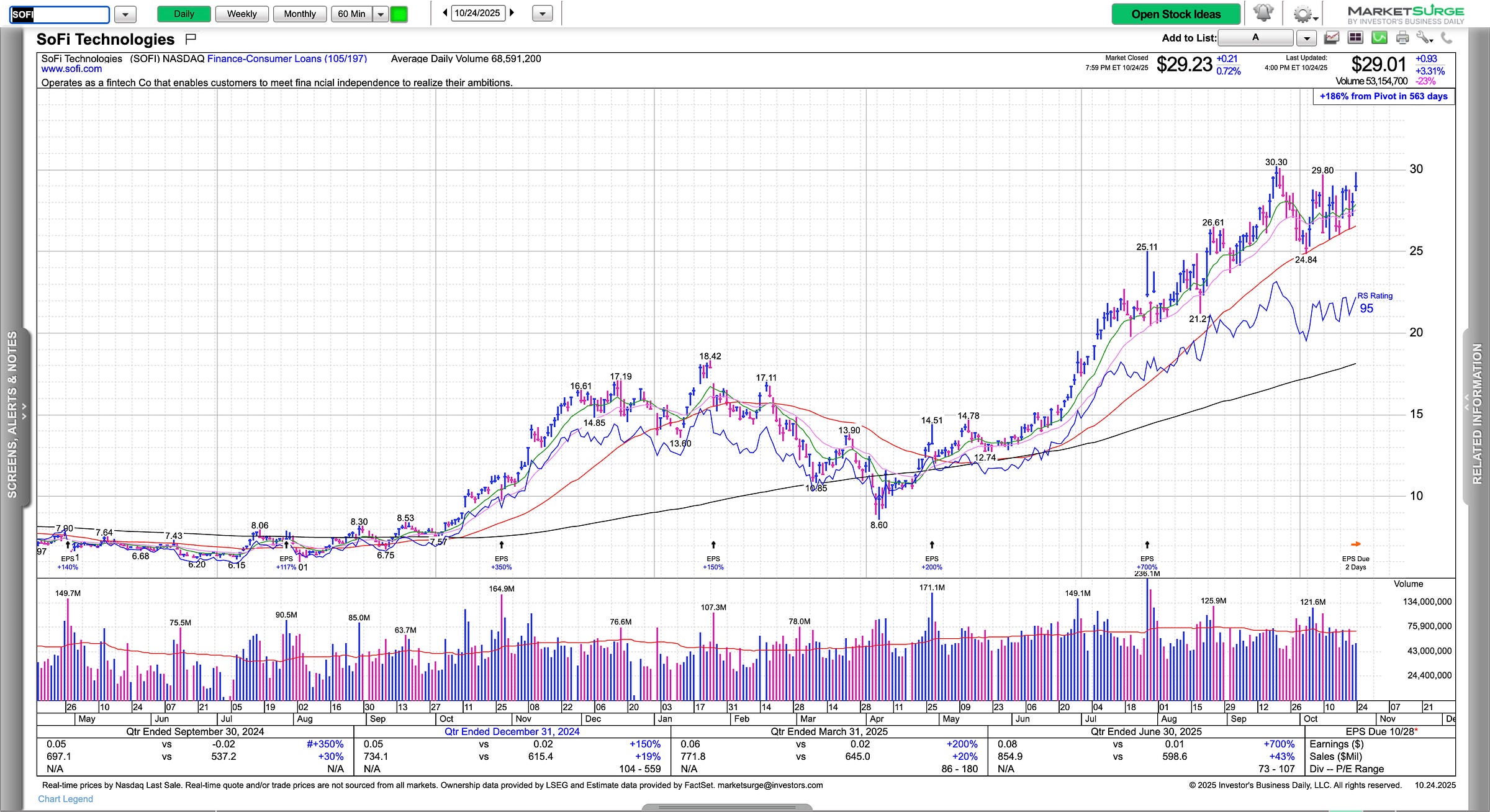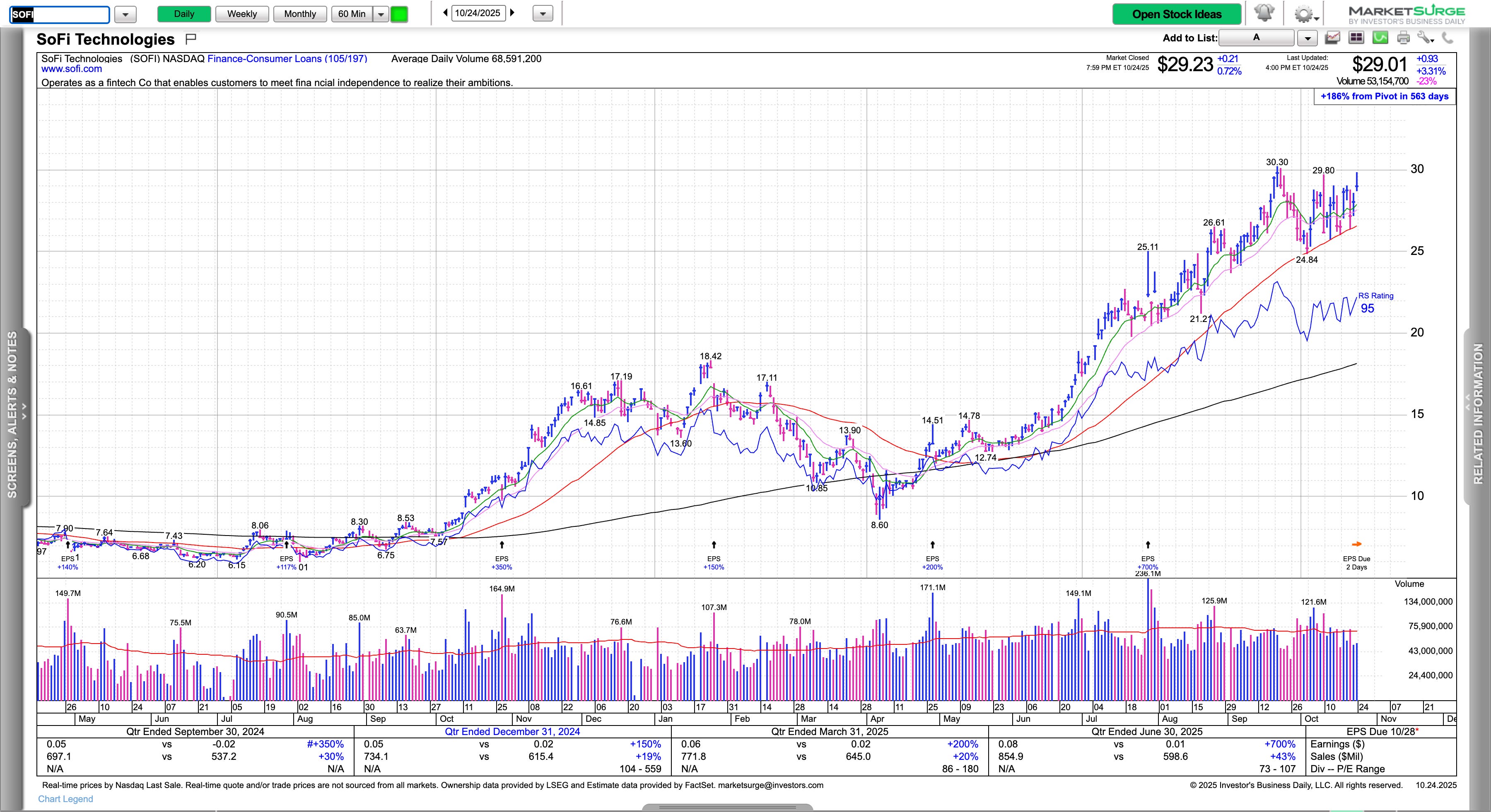 SOFI digested it’s recent gains well, pushing out last week to threaten a breakout.